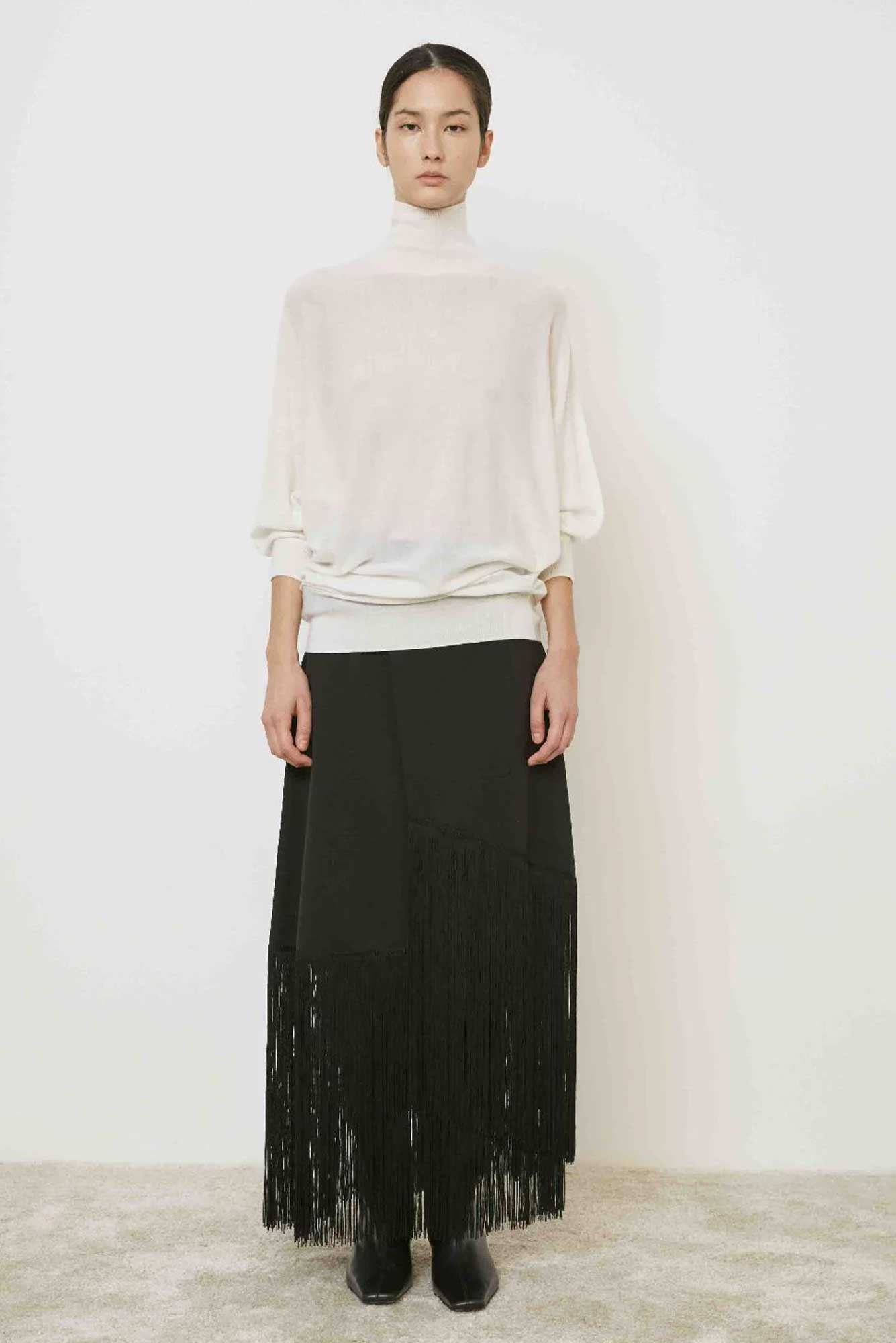 Gonna a portafoglio di Meimeij con dettaglio di frange sul bordo. Un modello dal design moderno e dinamico, perfetto per aggiungere movimento e stile a look casual o eleganti.